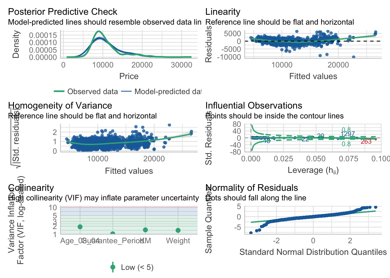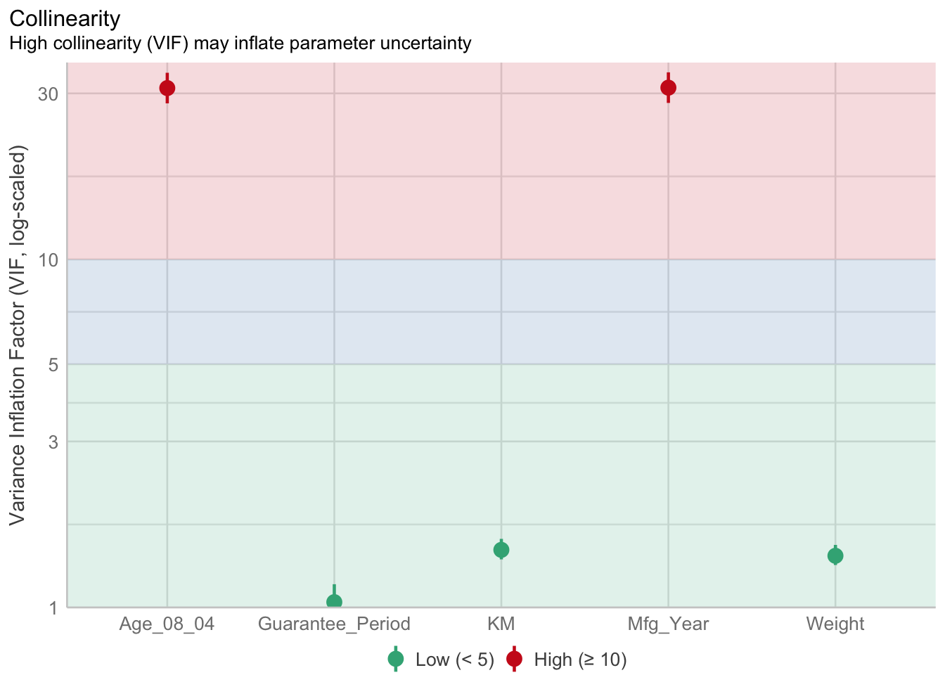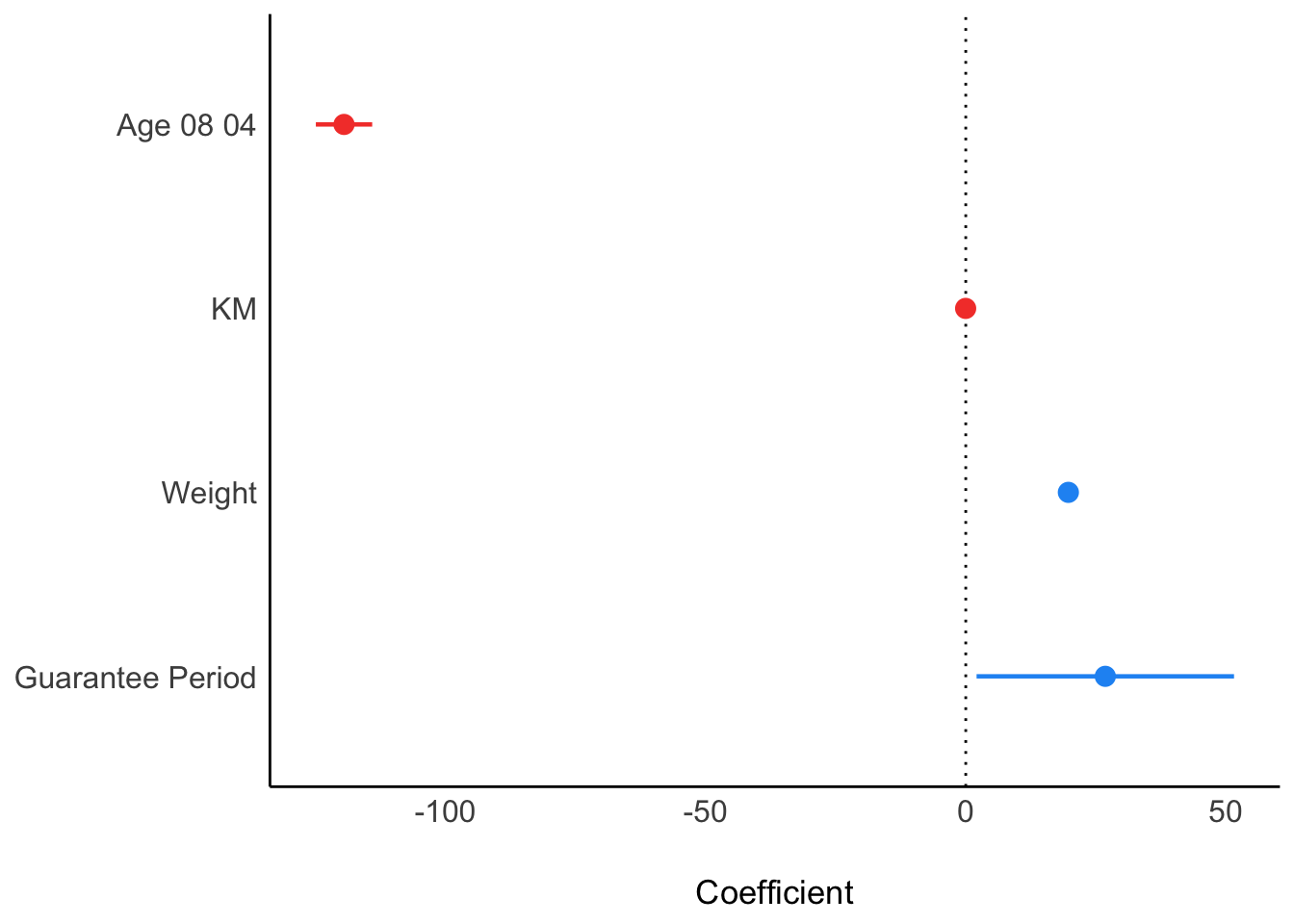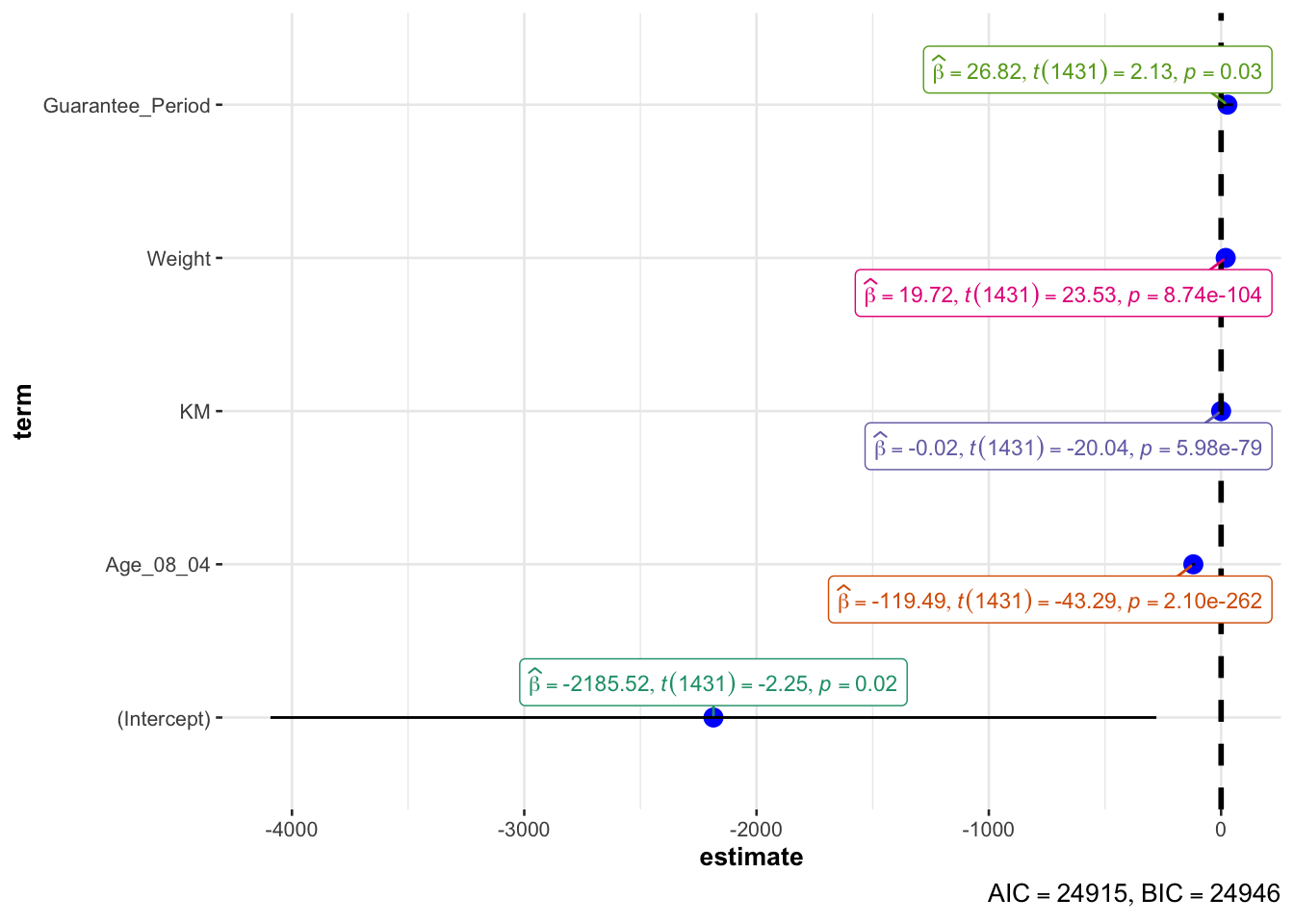 lm(formula = Price ~ Age_08_04 + Mfg_Year + KM + Weight + Guarantee_Period,