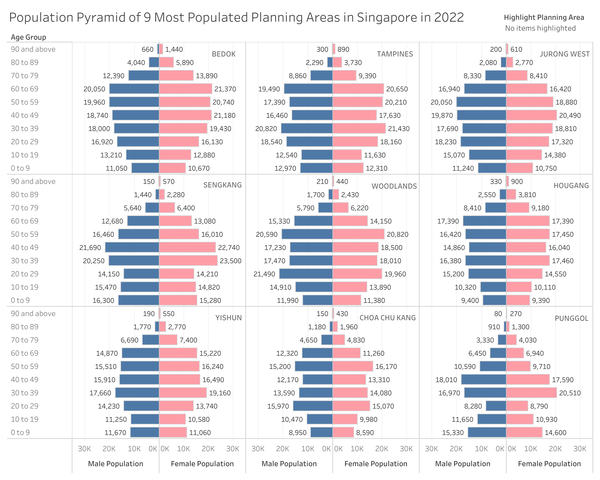 We have selected the most populated 9 planning areas in Singapore based on SingStat data dated in June 2022, namely: Bedok, Tampines, Jurong West, Sengkang, Woodlands, Hougang, Yishun, Choa Chu Kang, and Puggol, for visual analysis. These 9 planning areas are chosen as we can observe the population pyramid shape more clearly.