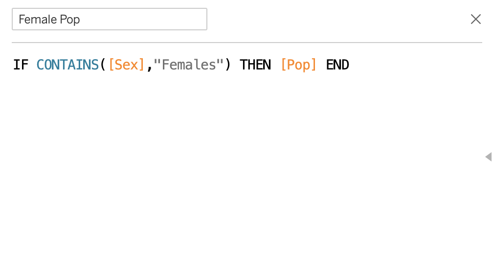 | 2 | Tabulate Female population. We created a calculated field for female population. Write a formula based on Population containing “female” word under “Sex” category to extract female population. |