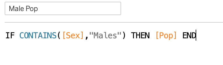 | 3 | Tabulate Male population. We created a calculated field for male population. Write a formula based on Population containing “male” word under “Sex” category to extract male population. |