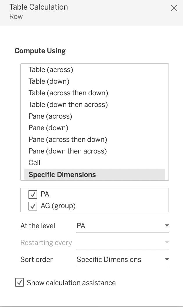 | 11 | Drag Column to Columns. Row to Rows. Edit the Table Calculation for both Row and Column. Change to “Compute using Specific Dimensions” and select PA. Choose “At the level” to be PA. Do the same for Column. |