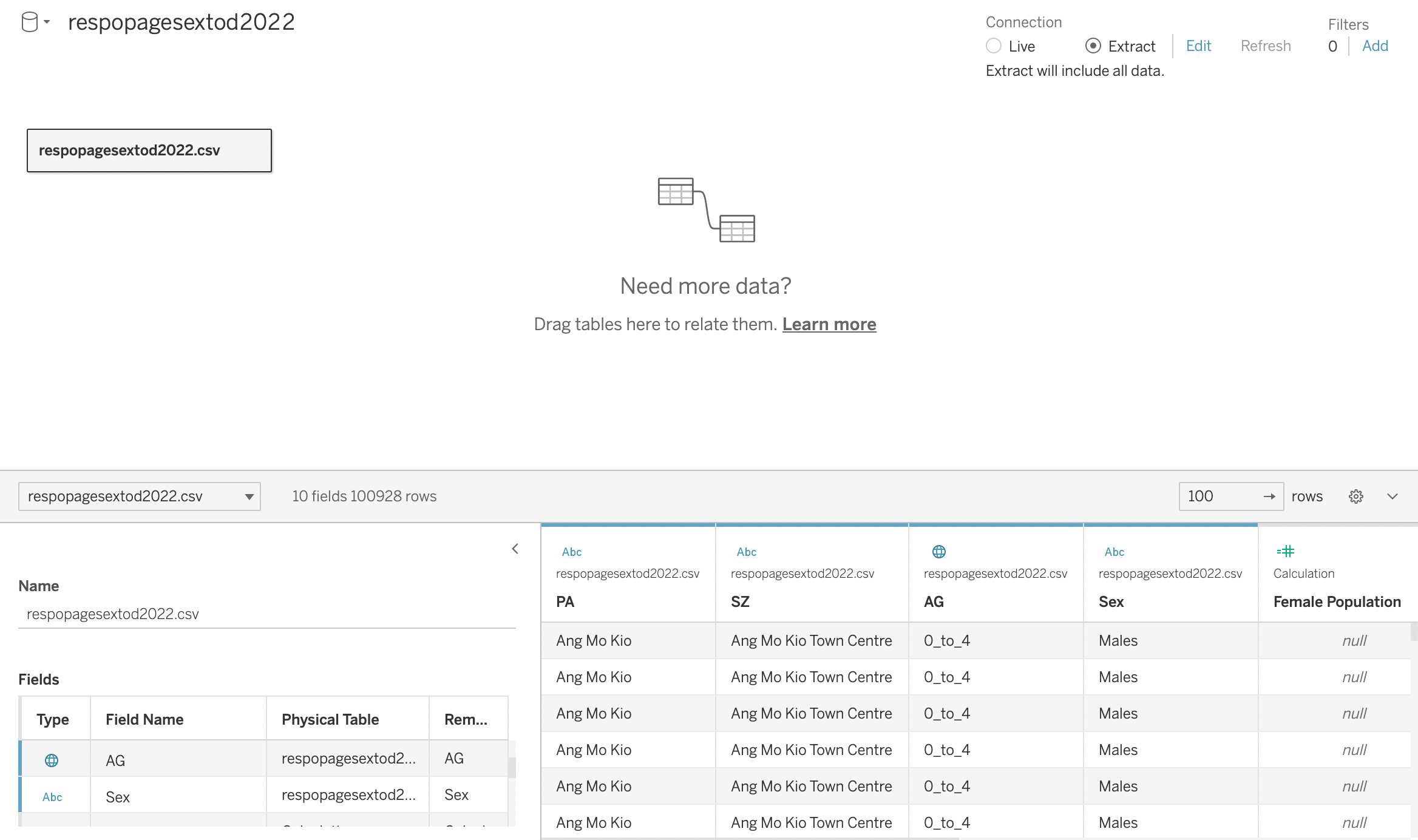 | 1 | Open Tableau Desktop, and load the downloaded file into Tableau using Text file. Once the raw dataset is loaded, drag the Singapore Residents by Planning Area / Subzone, Age Group, Sex and Type of Dwelling, June 2022 csv file into Tableau Desktop. |