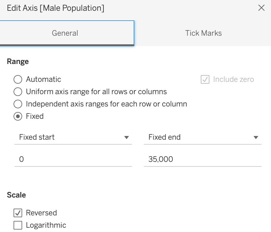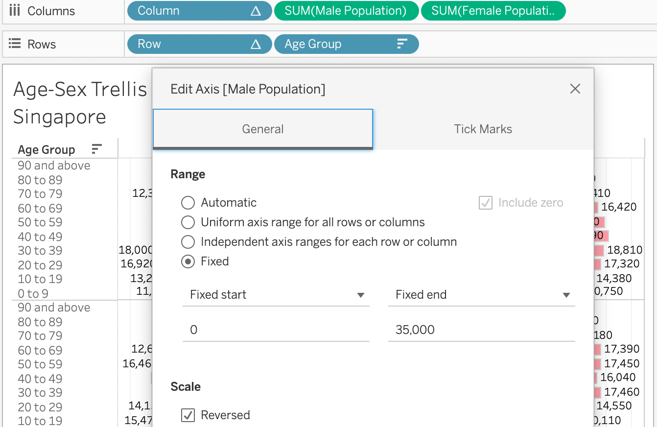 | 15 | Edit Axis of x axis (Female Pop and Male Pop). Choose Fixed range to be 0 to 35K. This is to make sure all population share x axis of the same range. |