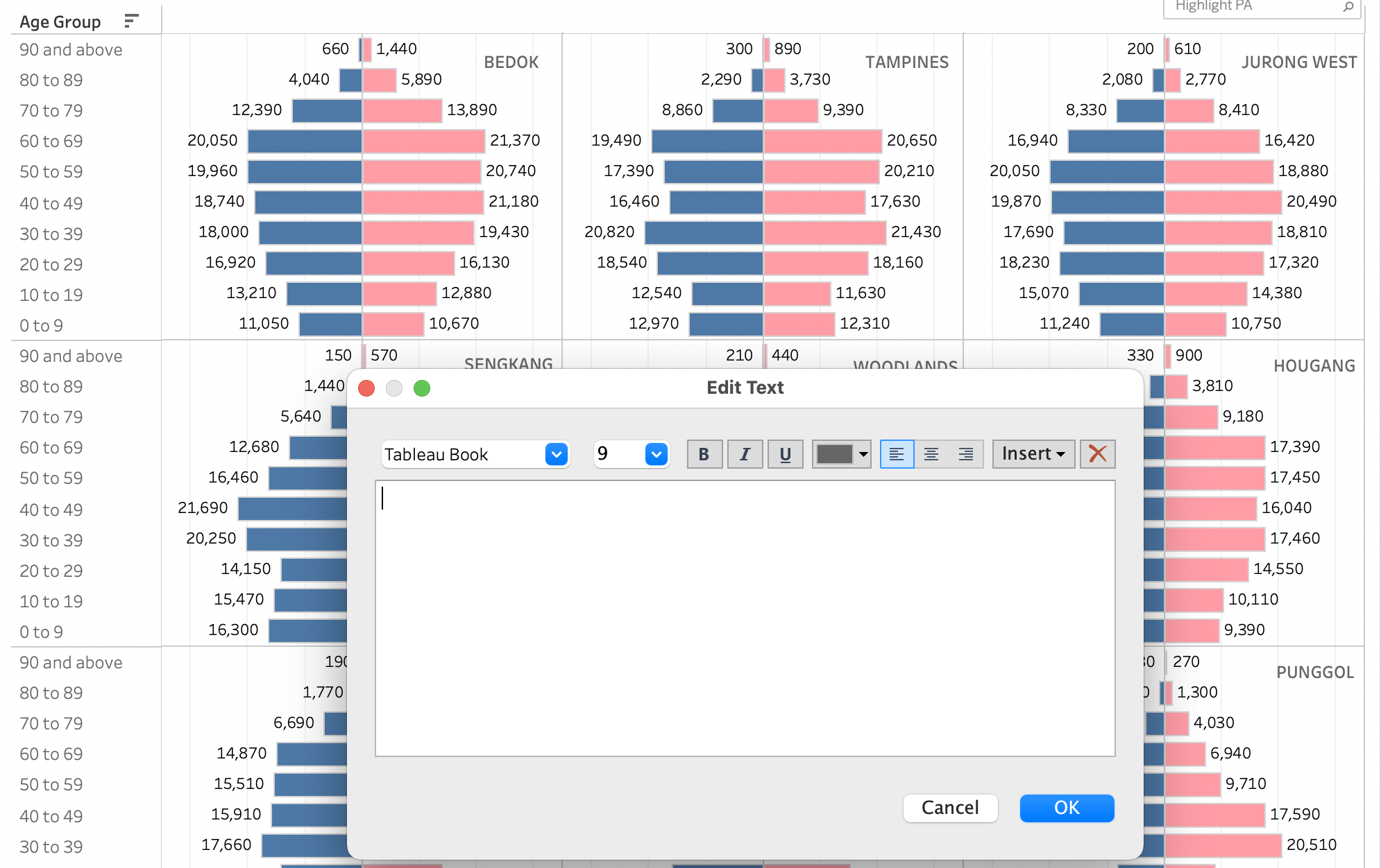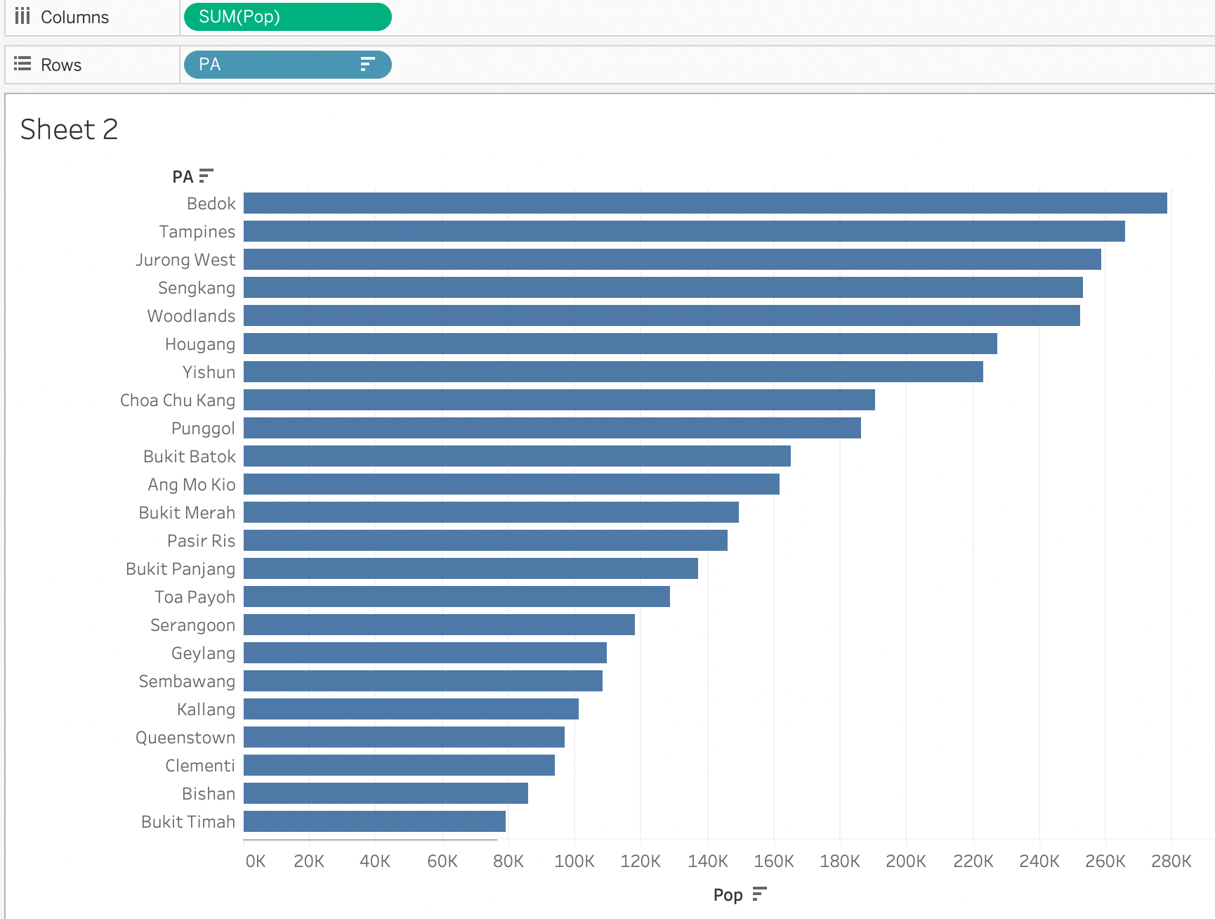 | 9 | Drag PA into Filters and select 9 most populated planning areas. We select the 9 most populated planning areas by opening another worksheet. Drag Pop into Columns and PA into Rows. Sort Pop in descending orders. From this chart, it’s clearly seen that the top 9 most populated planning areas are: Bedok, Tampines, Jurong West, Sengkang, Woodlands, Hougang, Yishun, Choa Chu Kang, and Puggol. Delete this worksheet after obtaining the planning area information. We filter the selected 9 PA in the original worksheet. |